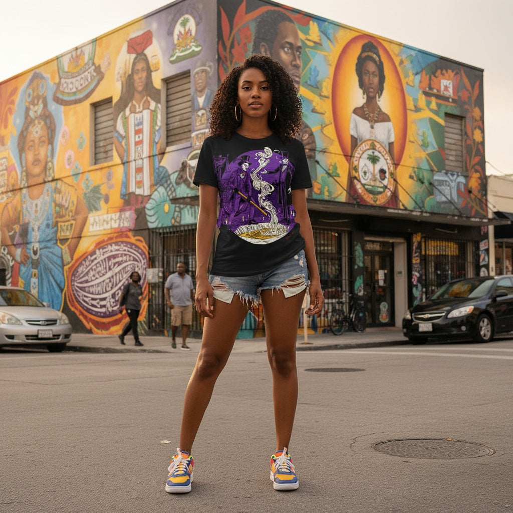 Crafted for the diaspora and those who carry Haiti in their heart, this drop blends ancestral energy with streetwear flair. Featuring rich symbolism, bold colors (Royal Purple, Bone White, Sacred Black, Sun Gold), and exclusive art elements derived from a single master illustration, each item is a collector’s tribute to the Gede spirit and Haitian resilience.
